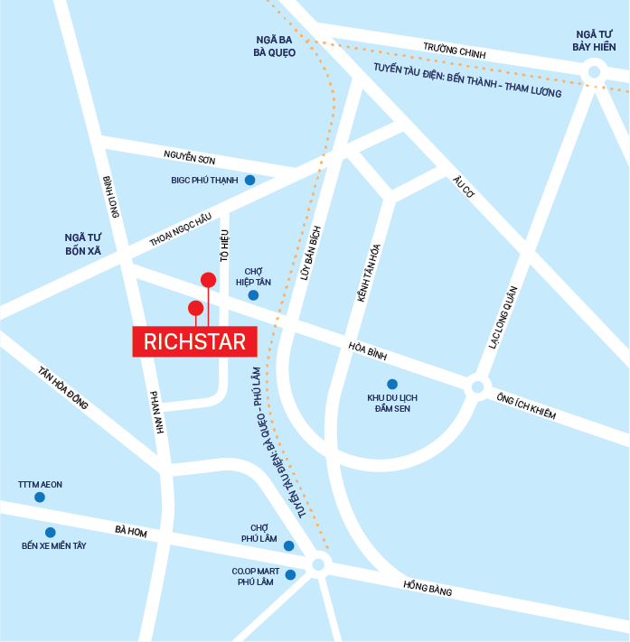 RichStar có vị trí nổi bật ngay góc 2 mặt tiền đường Hòa Bình - Tô Hiệu – trung tâm Quận Tân Phú với hệ thống hạ tầng cải thiện từng ngày. Từ đây, dễ dàng kết nối giao thông đến các quận trọng điểm của thành phố qua các trục đường huyết mạch: Lũy Bán Bích – tuyến đường ngầm hóa lưới điện đầu tiên tại Quận Tân Phú, kênh Tân Hóa – Lò Gốm – Tuyến cửa ngõ Tây Nam TP.HCM |